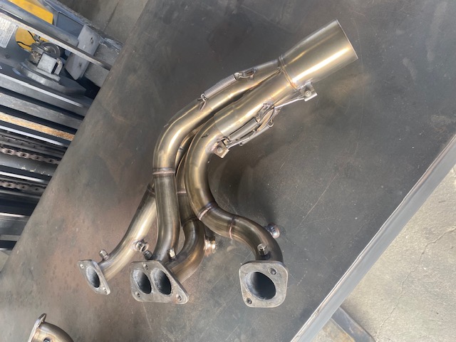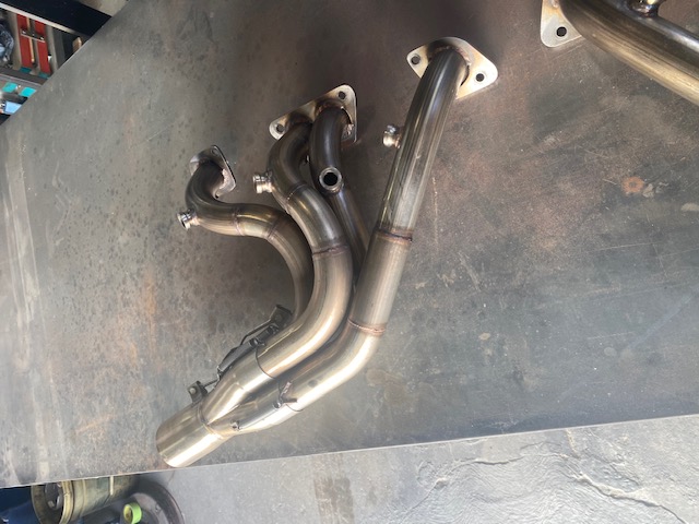 Gebler stainless SBC wedge headers. 1 3/4" - 1 7/8" - 2 3/4" choke - 3" outlet. Very good condition, 8 O'2 bungs, collector tethers. Off of Ness car, $2000, can be brought to Vegas or Pomona. 831-595-4720